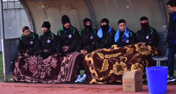 İlimizde oynanan amatör maçlarda soğuk havalar oyuncuları oldukça olumsuz etkiliyor. Karşılaşma süre alan oyuncular oyun içerisinde oldukları sebebiyle bir nebze ısınsa da yedek bekleyen oyuncular çareyi battaniye de buluyor.