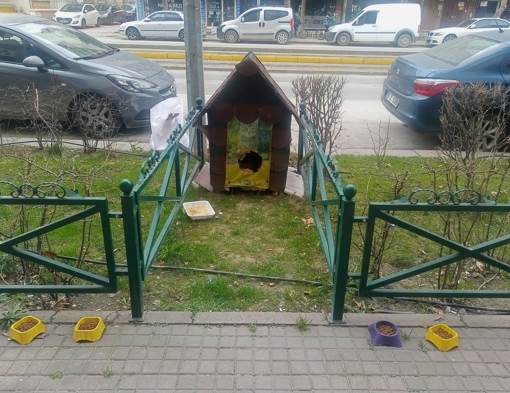 Eskişehir’de Vişnelik Tramvay Durağı'nın arka kısmında sokak kedilerinin barınması ve beslenmesi için yuva ve mama noktası oluşturuldu. Soğuk kış aylarında sokakta yaşayan kedilerin korunmasına yönelik bu düzenleme, hem hayvanların barınma ihtiyaçlarına cevap veriyor hem de beslenme desteği sağlıyor. Bölgeye yerleştirilen ahşap kedi yuvası, kedilerin soğuk hava koşullarından etkilenmeden sığınabileceği bir alan oluşturuyor. Yuva, yeşil alan içine yerleştirilmiş ve çevresi koruyucu demir çitlerle sınırlandırılmış durumda. Yuvanın ön ve yan kısımlarına mama kapları yerleştirilmiş olup kapların düzenli şekilde doldurulduğu gözlemleniyor. Plastik ve dayanıklı mama kaplarında bırakılan kuru mamalar, sokak kedilerinin beslenme ihtiyaçlarına destek oluyor.