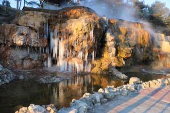 Afyonkarahisar’ın Sandıklı ilçesinde hava sıcaklıkları eksi 12 derecelere kadar düşünce Hüdai Kaplıcaları’nda yaklaşık 800 metre derinlikten çıkan yapay termal sıcak su şelalesi yer yer dondu.