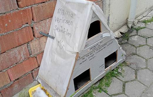Bir apartman duvarı kenarına yerleştirilen barınakta, hayvanların rüzgâr ve soğuktan korunabilmesi için kapalı bölmeler oluşturuldu. Barınağın önüne mama ve su kapları bırakılırken, üzerine yazılan notlarla çevreden geçenler de sokak hayvanlarına duyarlı olmaya çağrıldı.