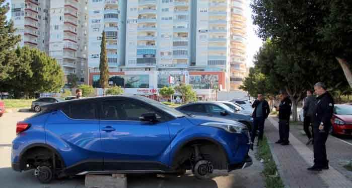 Antalya’nın Muratpaşa ilçesinde park halindeki lüks aracın 4 lastiği jantlarıyla birlikte çalındı. Komşularının telefon etmesiyle olay yerine gelen araç sahibi büyük şok yaşadı.