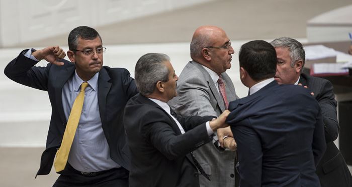 Daha sonra söz alan CHP Grup Başkanvekili Özgür Özel, Hamza Dağ’ın İzmir’de referans olduğu yöneticilerin FETÖ’cü çıktığını savunarak, tutuklanan bazı kişilerin adlarını okudu. Özel, “Kişinin kendini FETÖ şampuanıyla yıkayacağı hamam değil orası. Referans olduklarınızın FETÖ’cü çıktığıyla ilgili...” diyerek isim saymaya devam edince Meclis Başkanvekili Ahmet Aydın müdahale etti. Aydın, “Varsa bilginiz belgeniz yargı makamına verirsiniz. Sokaktaki her dedikoduyu getirip burada gerçekmiş gibi birilerini töhmet altında bırakarak konuşamayız” dedi. Gerilimin tırmanması üzerine Aydın görüşmeye ara verirken, CHP sıralarına yürüyen AK Partili Dağ ile Özgür Özel karşı karşıya geldi. Grupların karşılıklı yürümeleriyle arbede yaşanırken, idare amirlerinin müdahalesiyle kavga önlendi. Verilen arada CHP yönetimi, TBMM İçtüzüğü’ndeki “Meclis’te gürültü ve kavgaya sebep olmak” gerekçesinden dolayı Hamza Dağ’a kınama cezası verilmesini gündeme getirince Meclis bir süre daha çalışamadı. Yeni hükümlere göre kınama cezası alan milletvekilinin maaşının üçte biri kesiliyor. AK Partili yöneticiler de laf atan milletvekillerine de ceza verilmesi gerektiğini savundu. Bunun üzerine CHP ve AK Parti grup başkanvekilleri karşılıklı “Meclis’in saygınlığına özen gösterilmesi” dilekleriyle konuyu kapattı. Başkanvekili Aydın da “Maalesef hoş olmayan bazı söylemler ve fiili durumlar yaşadık” diyerek milletvekillerini uyardı.