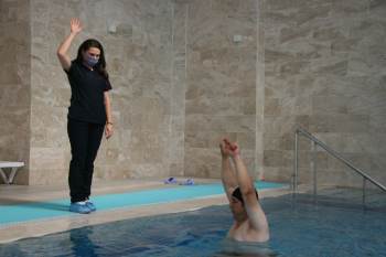 Eklem ve romatizmal hastalıkları olanlar ve şifa için geldikleri Oruçoğlu Termal Otel de fizyoterapistler eşliğinde egzersiz yaparak rahatlıyorlar.