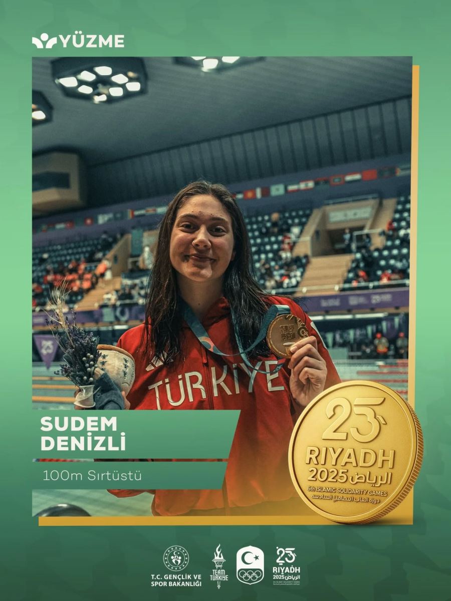 Riyad’da düzenlenen 2025 İslami Dayanışma Oyunları’nda Türkiye’yi başarıyla temsil eden milli yüzücü Sudem Denizli, kadınlar 100 metre sırtüstü yarışında etkileyici performansıyla altın madalya kazandı. Denizli, 1:02.31’lik derecesiyle rakiplerini geride bırakarak kürsünün en üst basamağında yer aldı. Mücadelenin başından sonuna kadar üstün bir tempo ortaya koyan milli sporcu, elde ettiği sonuçla Türkiye’nin yüzmedeki başarısına bir yenisini daha ekledi. Eskişehir Gençlik ve Spor İl Müdürlüğü, Sudem Denizli’yi tebrik ederek bu önemli başarının genç sporcular için ilham verici olduğunu belirtti.