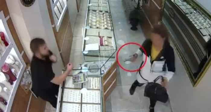 Gaziosmanpaşa’da müşteri kılığında bir kuyumcuya giren kadın soyguncu, koluna ve boynuna taktığı 600 bin lira değerindeki altınları çaldı. Çantasından para yerine silah çıkartan kadın kaçtıktan kısa süre sonra yakalanırken, soygun anı kameraya yansıdı.