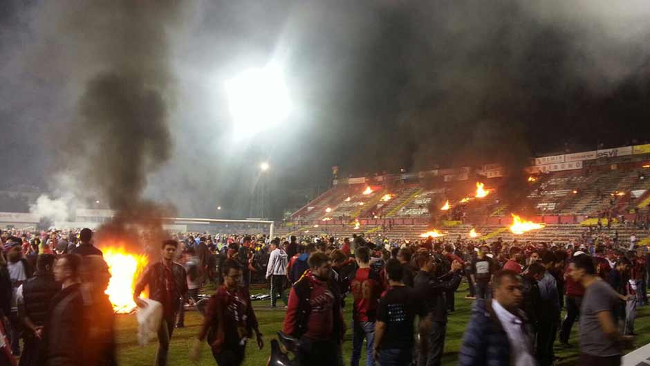 Yangın, soyunma odalarına giden merdivenlere de sıçradı. Öte yandan sahadan ayrılan taraftarlar, tribünden koltukları da beraberinde götürdü.