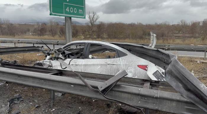 TEM Otoyolu'nun Bolu geçişinde, sürücüsünün direksiyon hakimiyetini kaybetmesi sonucu kontrolden çıkan otomobil, bariyerlere çarparak adeta ok gibi saplandı. Tavanı ve motoru farklı yerlere savrulan araçta sıkışan sürücü ağır yaralandı.