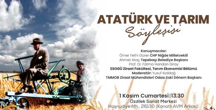 Tepebaşı Belediyesi tarafından düzenlenecek “Atatürk ve Tarım” söyleşisi Özdilek Sanat Merkezi’nde gerçekleştirilecek. Tepebaşı Belediye Başkanı Dt. Ahmet Ataç, CHP Niğde Milletvekili Ömer Fethi Gürer ve ESOGÜ Ziraat Fakültesi Tarım Ekonomisi Bölümünden Prof. Dr. Fatma Handan Giray’ın konuşmacı olarak yer alacağı söyleşinin moderatörlüğünü ise Yusuf Kızıldağ yapacak. Söyleşi, 1 Kasım Cumartesi günü saat 13.30’da gerçekleştirilecek.