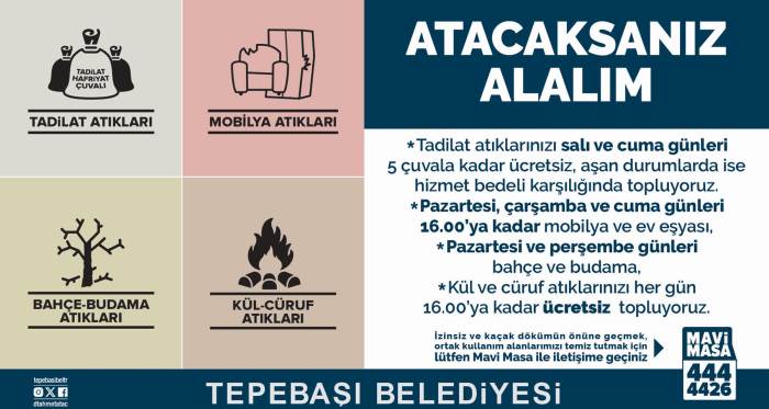 Tepebaşı Belediyesi, Eskişehirlilerin memnuniyeti ve temiz çevre duyarlılığı ile sürdürdüğü çalışmaları aralıksız biçimde sürdürüyor. Temizlik İşleri Müdürlüğü'ne bağlı ekipler, Mavi Masa'ya ulaşan vatandaşların, bahçe ve budama atıklarından kül ve cüruf atıklarına, mobilya ve ev eşyası atıklarından tadilat atıklarına kadar her türlü atığı, gelen talepler doğrultusunda evlerinden teslim alıyor. Ekipler; bahçe ve budama atıklarını Pazartesi ve Perşembe günleri ücretsiz, kül ve cüruf atıklarını her gün saat 16'ya kadar ücretsiz, mobilya ve ev eşyası atıkları Pazartesi, Çarşamba ve Cuma günleri saat 16.00'ya kadar ücretsiz ve tadilat atıklarını 5 çuvala kadar ücretsiz olmak üzere Salı ve Cuma günleri alıyor. 2011 yılından bu yana 5 çuvala kadar olan tadilat atıkları, Tepebaşı Belediyesi tarafından ücretsiz olarak alınırken, 5 çuvalı aşan atıklarda ise belirli oranda hizmet bedeli alınıyor.