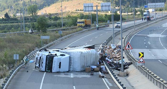 Kaza, Sakarya- Bilecik karayolu Osmaneli Kavşağı’nda meydana geldi. Edinilen bilgiye göre, Şükrü Kürklü idaresindeki 42 FIV 75 plakalı plastik malzeme yüklü tır sürücüsünün direksiyon hakimiyetini kaybetmesi sonucu bariyerlere çarparak devrildi. Durumun bildirilmesi üzerine olay yerine sağlık, polis ve itfaiye ekipleri sevk edildi. Polis ekipleri trafiğin kontrollü bir şekilde akışını sağlarken, devrilen tır vinç yardımıyla emniyet şeridine çekildi. Ardından trafik kontrollü bir şekilde ulaşıma açıldı.