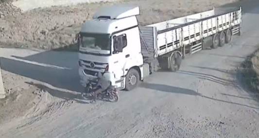 Öte yandan, yaşanan kazı anı ise çevredeki bir güvenlik kamerasına yansıdı. Görüntülerde tırın motosiklete çarptıktan sonra sürüklediği görülüyor.