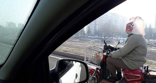 Kafasına geçirdiği poşete yolu görebilmek için iki delik açan motosiklet sürücüsü trafikte bu şekilde yolculuk etti.