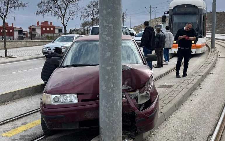 Eskişehir’de virajda sürücüsünün kontrolünden çıkan otomobil, tramvay yoluna girerek kataner direğine çarptı. Kaza nedeniyle tramvay seferlerinde aksama meydana geldi.