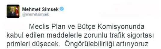 Başbakan Yardımcısı Mehmet Şimşek torba kanun tasarısı kapsamında yer alan zorunlu trafik sigortası primleriyle ilgili müjdeyi 'Twitter'dan verdi.