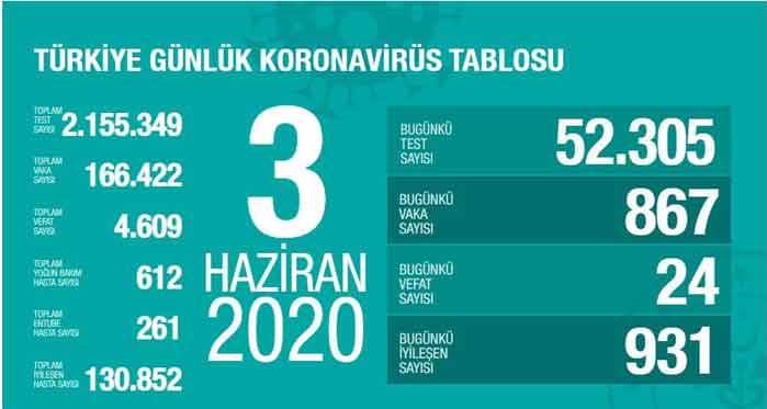 Bugün yapılan 52 bin 305 testte pozitif vaka sayısı 867 olurken, 931 hasta da iyileşti.