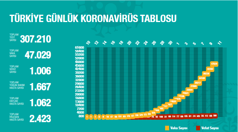 Toplam test sayımız 307 bin 210 oldu. Bugün 30 bin 864 yeni test yapıldı. 4 bin 747 yeni vaka var. 98 kişi ile birlikte toplam vefat sayımız 1006 oldu.
