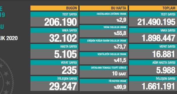 Sağlık Bakanlığının Covid-19 bilgilendirme sayfasında Türkiye'nin güncel korona virüs tablosu kamuoyuyla paylaşıldı. Tabloya göre son 24 saatte 235 kişi korona virüsten hayatını kaybetti, toplam can kaybı 16 bin 881'e yükseldi. Toplamda 21 milyon 490 bin 195 test yapıldı. Bugün yapılan 206 bin 190 testten, 32 bin 102 yeni vaka sayısı, 5 bin 105 kişinin de hastaneye yatan vaka olduğu belirtildi.