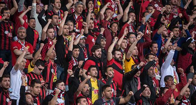 Kilometreleri hiçe sayarak Antep’in yolunu tutan taraftar kendilerine ayrılan tribünü hınca hınç doldurdu. Başlama düdüğünden itibaren takımlarına büyük destek veren Eskişehirspor’un cefakar taraftarı Türkiye’ye tribün dersi verdi. Taraftarlar maç sonunda futbolcuları çağırarak alınan 1 puanı kutladı.