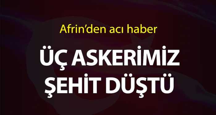 Başbakan Binali Yıldırım, TSK birliklerinin faaliyeti sırasında el yapımı patlayıcının infilak etmesi sonucu bugün Afrin'de 3 askerin şehit düştüğünü açıkladı.