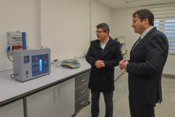 Rektör Taş’a ziyaretinde Proje Koordinatörü Doç. Dr. Cenk Karakurt, Öğr. Gör. Merve Paksoy ve Arş. Gör. İlhan Aslan eşlik ederek laboratuar çalışmaları ve cihazlar hakkında bilgi verdi.