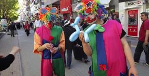 Eskişehir Yediler mevkiinde dolaşan palyaço kıyafeti giymiş iki üniversite öğrencisi, balon yaparak ve satarak harçlıklarını çıkarıyorlar.