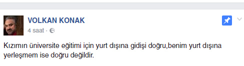Volkan Konak üç çocuğu ve eşiyle birlikte Amerika’nın Washington şehrine yerleşeceği yönünde çıkan haberlere Twitter’dan açıklık getirerek yalanladı. Konak şunları söyledi: “Kızımın eğitimi için yurt dışına gittiği doğru,benim yurt dışına yerleştiğim ise doğru değildir.”
