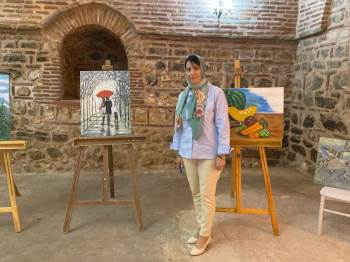 Bilecik’in Gölpazarı ilçesinde yağlı boya resimleri tarihi Taşhan binasında sergilenirken, sergiye büyük ilgi oldu.