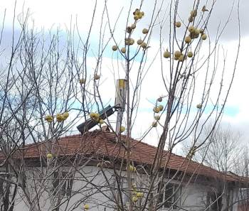 Beyköy yolu üzerinde bulunan bir evin bahçesindeki yaprakları dökülmüş elma ağacının toplanmayan meyvelerin oluşturduğu ilginç görüntü yoldan geçenlerin ilgisini çekiyor.