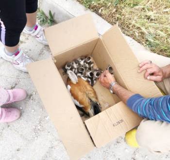 Tavşanlı ilçesi Kütahya karayolu Çobanköy kavşağında 11 yavrulu yaralı yaban ördeği ailesi, hayvan sever öğrenci Beren Aydın tarafından Tavşanlı belediyesi barınağına teslim edildi.