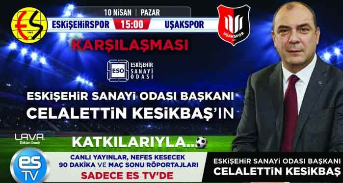 TFF 2. Lig’in 34’üncü haftasında 10 Nisan Pazar günü saat 15.00’de Eskişehirspor ile Uşakspor arasında oynanacak olan mücadele Eskişehir Sanayi Odası Başkanı Celalettin Kesikbaş’ın katkılarıyla ES TV’den canlı olarak yayınlanacak.