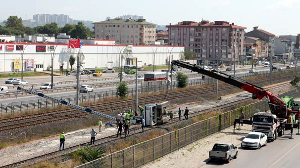 Kocaeli’de tren yolu inşaatında çalışan sondaj makinesinin tren yoluna devrilmesiyle iptal olan tren seferleri 7 saat sonra yeniden başladı.