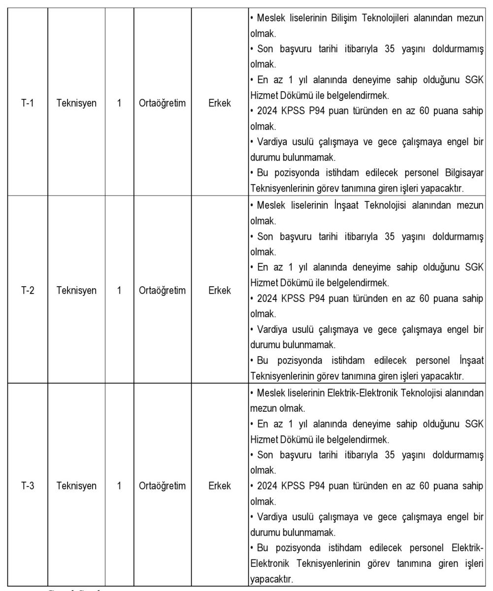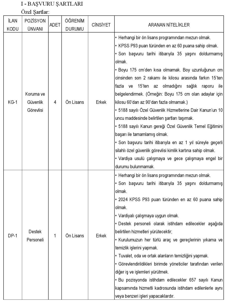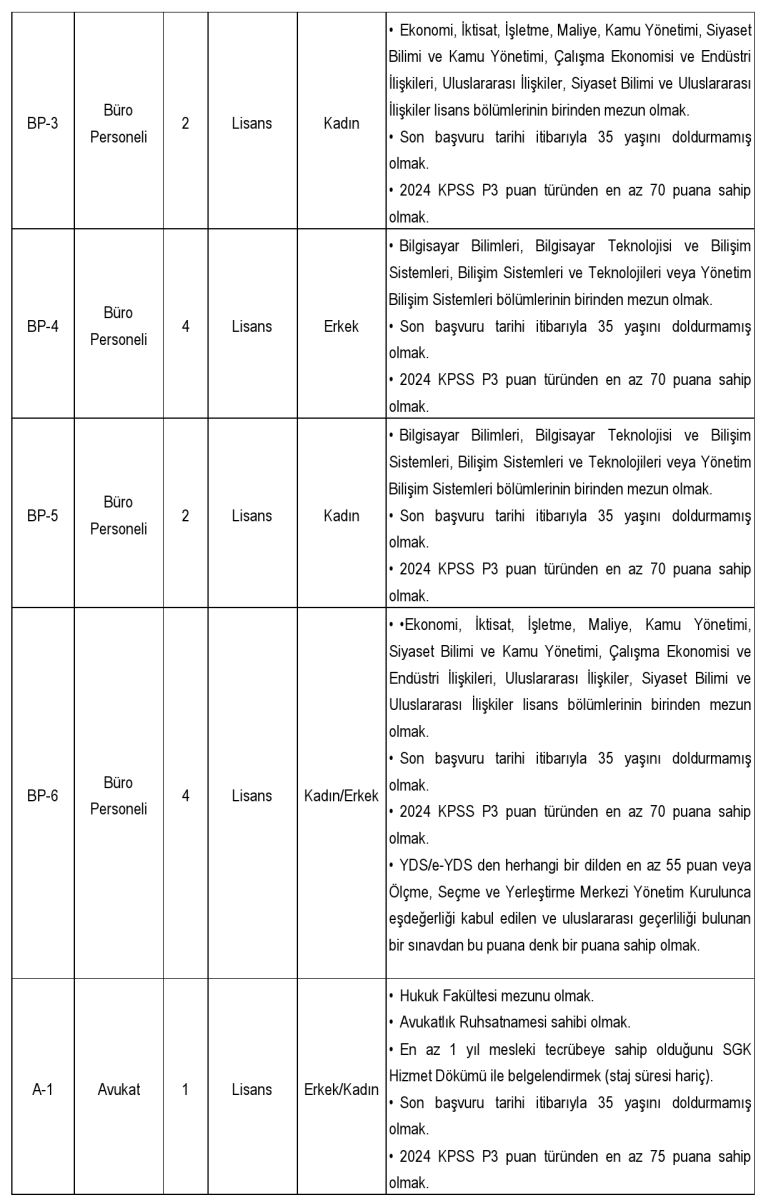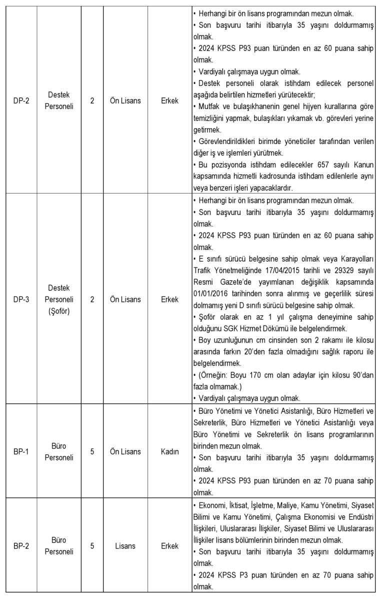 Alım yapılacak kadrolar arasında koruma ve güvenlik görevlisi, destek personeli (temizlik, mutfak, şoför), büro personeli, avukat ve çeşitli alanlarda teknisyen kadroları yer alıyor. Toplam 35 kişilik kontenjanın farklı öğrenim düzeylerinden adaylara açık olduğu bildirildi.