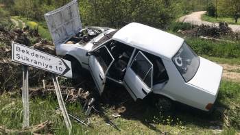 Yoldan Çıkan Otomobil Son Anda Ağaç Kütüklerine Çarparak Durabildi
