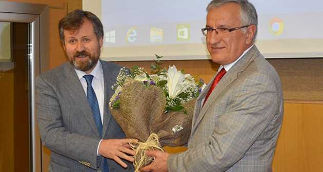 Konferans sonunda Eğitim Fakütesi Dekanı Prof. Dr. Muhsin Macit, Atatürk Kültür, Dil ve Tarih Yüksek Kurumu Atatürk Kültür Merkezi Başkanı konuşmacı Prof. Dr. Turan Karataş’a çiçek takdim etti.
