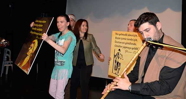 Düzenlenen şiir ve müzik dinletisine Vali Yardımcısı Ömer Faruk Günay, Tepebaşı Başkan Vekili Nuray Akçasoy, Engelliler Koordinasyon Merkezi Müdürü Kemal Yıldırım, Sakatlar Derneği Şube Başkanı Cafer Eşen ile engelli bireyler ve aileleri katıldı. Koordinasyon Merkezi öğrencileri “Gel Gör Beni Aşk Neyledi” adlı dans ve “Buğday Menkıbesi” adlı drama gösterisini sahneleyip, “Sordum Sarı Çiçeğe” isimli ilahi seslendirdiler. Programa Yavuz Kenardağ ney dinletisi ile eşlik etti. Vali Yardımcısı Günay ve Başkan Vekili Akçasoy, program dolayısıyla Koordinasyon Merkezi Müdürü Kemal Yıldırım ve Sağlık İşleri Müdürü Mehtap Cibiş’e çiçek takdim etti. Etkinlik sonrası bir konuşma yapan Vali Yardımcısı Günay, “Bu sene kurumların Yunus Emre ile ilgili program yapmasını istemiştim. Bu kadarını da hiç beklemiyordum. Bugün burada engelli kardeşlerimizi eğittiğimiz zaman bizden bir farklarının da olmadığını gördük. Yunus aslında kalbimizde yaşıyor. Bu grubun gösterisi gerçekten etkileyici idi, ders almak gerekir. Sağlıklı pek çok insanın ders alması gerekir. Bugün buraya sırf Yunus Emre etkinliği var diye geldim, çok gururlandım ve duygulandım” dedi.