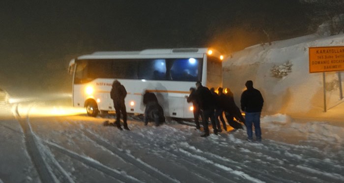 Kar yağışı gece boyunca etkisini sürdürürken sürücülere zor anlar yaşatıyor. Yolda kalan araçlar vatandaşlar tarafından kurtarılıyor.